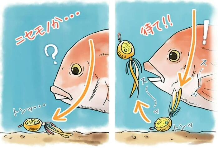 「鯛ラバを落として気づかせて追わせ、着底から巻き上げのアクションの切り替えで喰うことが多い。 でも、トンッと着底してしばらく底に置くとニセモノと見破られます。だから、着底したら即巻き上げるタッチ&ゴーが重要なんです。」(赤澤さんの鯛ラバの基礎知識 より)