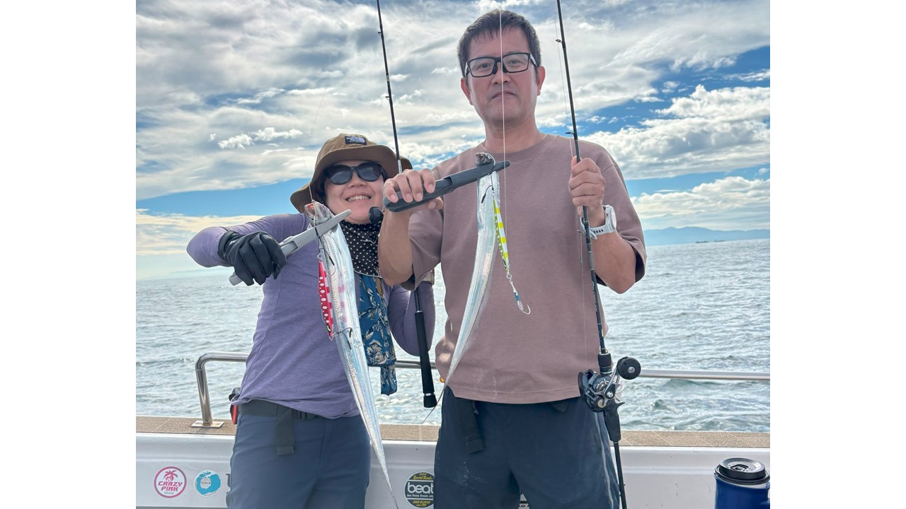 その後も、ポイントを移動しつつタチウオ狙いに変更。ストライプ模様のジグに反応が出はじめ、見事タチウオを釣り上げる参加者の方も!