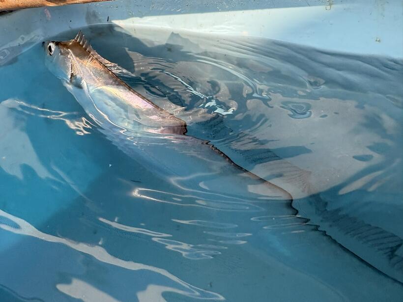船上で改めて観察してみると、タチウオは驚くほど細長く、体表は金属のように光り輝いています。特に印象的だったのは、背びれの動き。針から解放されると、まるでリズムを刻むように背びれを小刻みに揺らし、生命力を誇示しているように見えました。