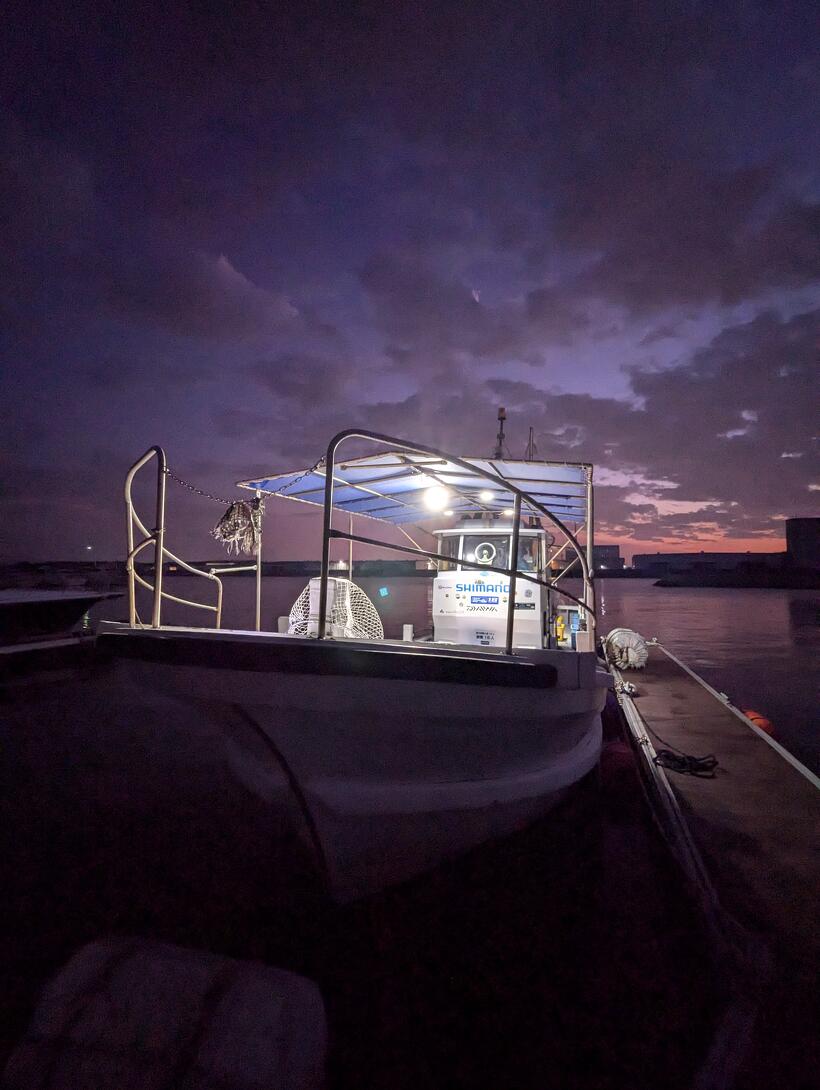 港に着くと、まだ夜が明けきらない空の下に釣り人が集まっていました。エンジン音と潮の匂いに包まれ大阪湾の中心へ繰り出すと、不思議と心が高鳴ってきます。
