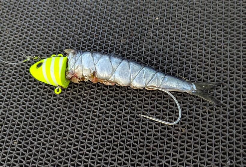 テンヤに付けたイワシはボロボロ。キレイに巻いたはずの針金も乱れています。頭の重りにはタチウオの牙も刺さっていました。