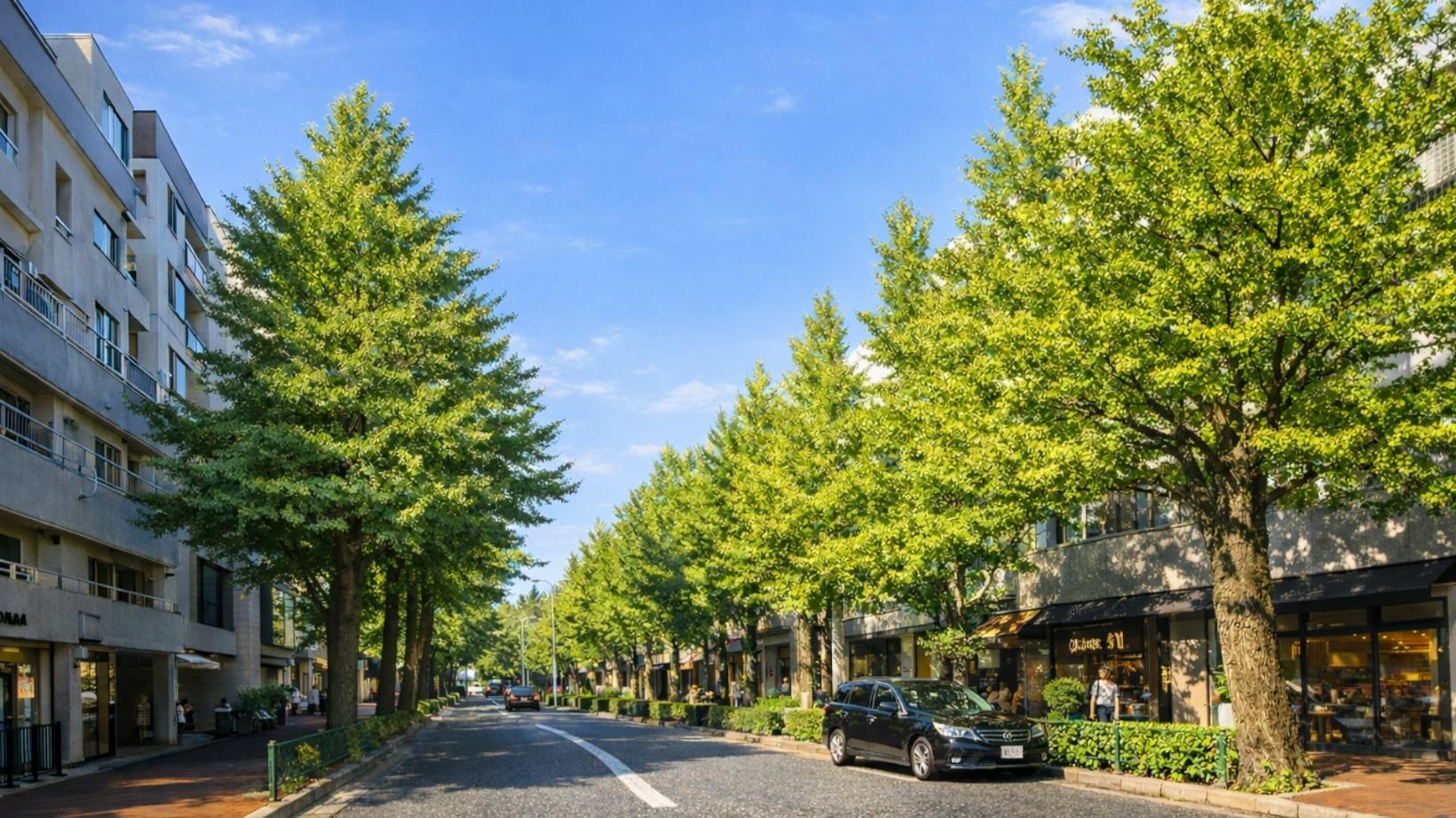 都内屈指のおしゃれストリート「プラチナ通り」。豊かな銀杏並木に沿って、選び抜かれたカフェやショップが静かに軒を連ねます。