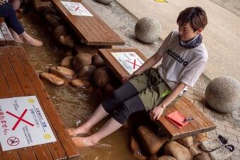 Casa Ciclismoさんを出て、近くにある太閤の足湯へ。ここは屋外に設置された無料で利用できる足湯スポットです。素足をつけると想像以上に温かく、開放感が足元から湧き上がってきました。