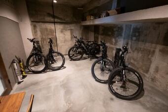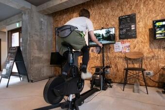 ビギナーでも安心して六甲を楽しめるよう、8台のレンタルバイクにはMTBタイプのE-Bikeをスタンバイ。1階にはスマホキーで開閉できる駐輪場があり、気兼ねなく自転車を置いておけます。2階のカフェスペースで特に目を引くのが2台のWAHOO KICKER BIKE。画面には自転車ゲームアプリROUVYによる有馬から六甲に向かう実際の映像、そこにアバターがペダリングに応じて走る最高クラスの設備です。