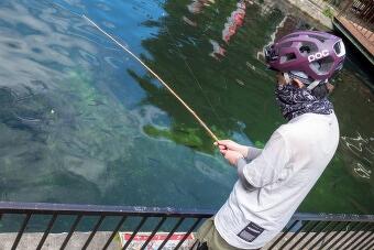竹竿と餌、バケツを受け取り、さっそく釣り池へ。餌は粘土のような練り餌で、小さくちぎって針につけるだけでOK。これなら釣りが初めてのYUKIさんでも抵抗感なくできますね。「うちのニジマスは食いしん坊なので、糸を垂らすとすぐに群がってきますよ」と聞いていたとおり、YUKIさんがエサを投入した途端ニジマスが集まる集まる。浮きを確認する間もなくあっという間にエサを取られてしまい、「食い逃げ〜」と叫ぶYUKIさん。気持ちはわかるけど(笑)。