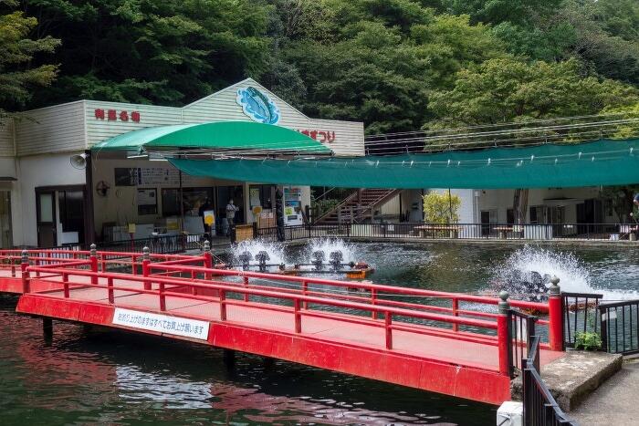 木々に囲まれた気持ちのいい場所にある「有馬ます池」は、鼓ヶ滝からの清流を利用した釣り池でニジマス釣りを楽しめるスポット。利用料は1人1,400円で、この中には3匹分の利用料と竿と餌代、唐揚げ調理代が含まれています。ここのニジマスは愛知県で養殖されたもので、斑点が少なく銀色に輝く姿が特徴だそうです。