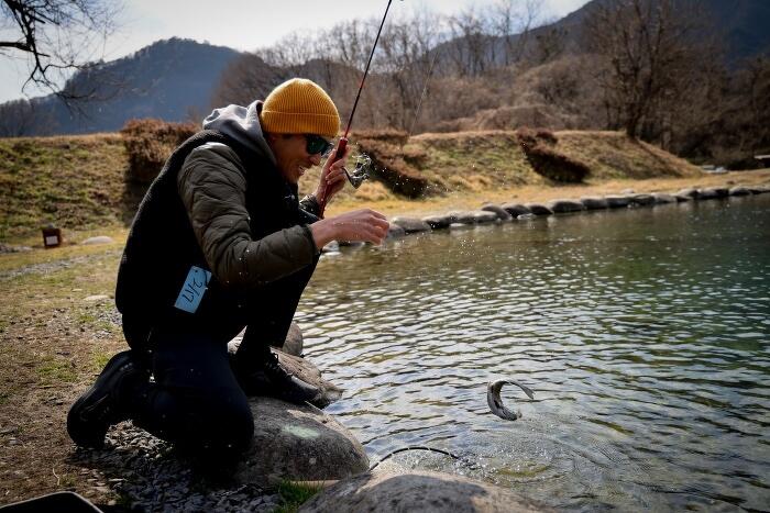 今回の釣り場は「大芦川F&Cフィールドビレッジ」。渓流としても名高い大芦川のほとりにある管理釣り場で、地下水による水の美しさと魚の好コンディションが評判のエリアだ。平日の昼過ぎだというのに、大勢のアングラーが竿を振っている。この地のエリアトラウト熱がうかがえる。