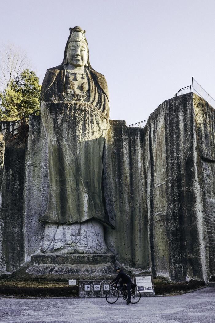 ダイナミックな岩稜が現れた。大谷石の石切場ということだが、そのスケール感に圧倒される。大きな観音様は観光名所となっていて、近くの道の駅ベルテラシェ大谷には、大谷石でできた建物も。ほんのりとベージュだったりピンクがかった色味が温かさを感じさせ、なるほど建材として支持されるのもわかる気がする。黒い斑点は「ミソ」と呼ばれ、大谷石ならではの特徴なのだとコーイチさんが教えてくれた。
