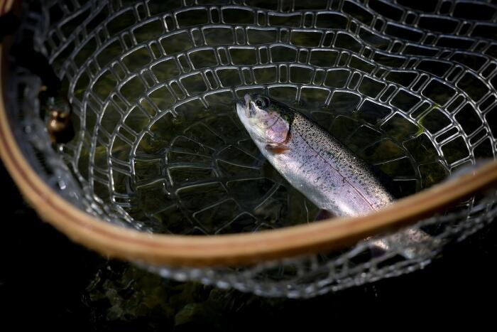 のった! 小気味よいダッシュを見せて走るニジマスをいなして無事ネットイン。自転車でここまでやってきて釣った本日のファーストフィッシュ、いつもよりもなんだか嬉しい。さぁ、まだまだ釣るぞ。ボックスには使いたいルアーがたくさんあるのだ。