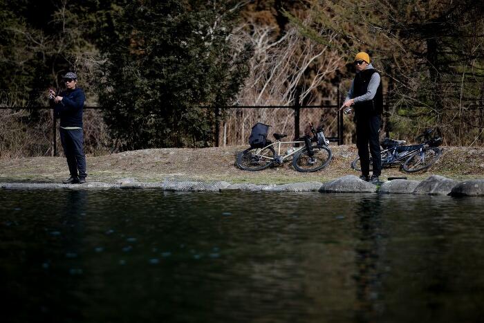 普段は駐車場スペースに駐輪してほしいとのことだが、今回は特別に許可をいただき自転車を釣り場まで持ち込ませてもらった。バイクからパックロッドを取り出し組み立てていると、水面を魚が跳ねる音が聞こえてくる。どうやら魚の活性は高そうだ。