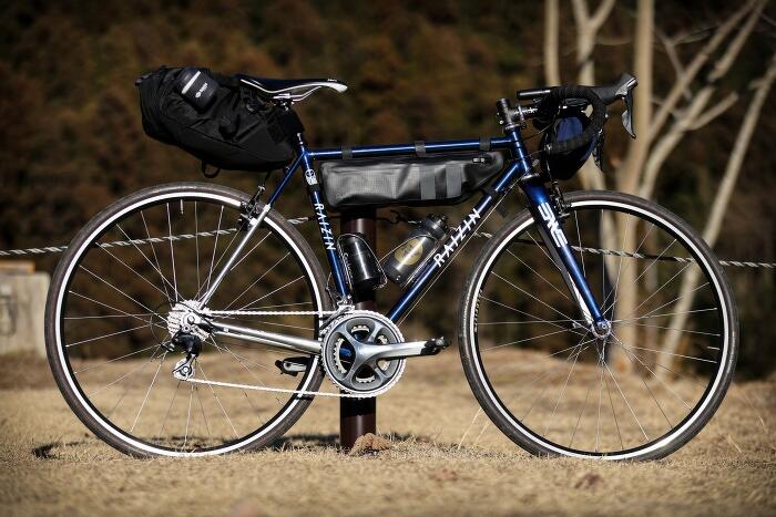 コーイチさんが乗るスチールロードバイクは群馬のライジンワークス製。フレームバッグや大型サドルバッグ、ハンドルバーバッグを搭載したバイクパッキング仕様に、エリアトラウトの道具一式がすっぽりと収まっている。比較的装備が身軽にできるのも、この釣りならでは。自転車との相性が良いのである。