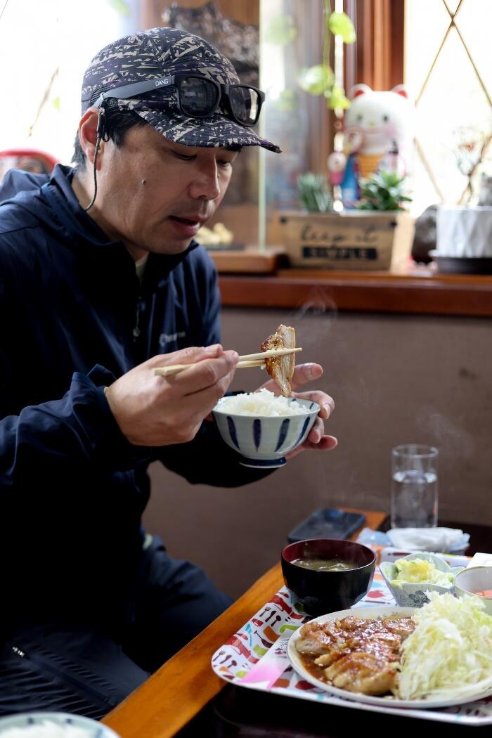 目指す管理釣り場が近づいてきたが、時刻はまもなく正午。ここまで20kmほどゆっくりと走ってきたが、釣りの前には腹ごしらえをしておきたい。ふらりと立ち寄った釣り場近くの食堂がこれまたいい雰囲気で、そして筆舌に尽くしがたいほどの美味であった。これは嬉しい出会い。釣りの前に士気がもう一段高まったのだった。