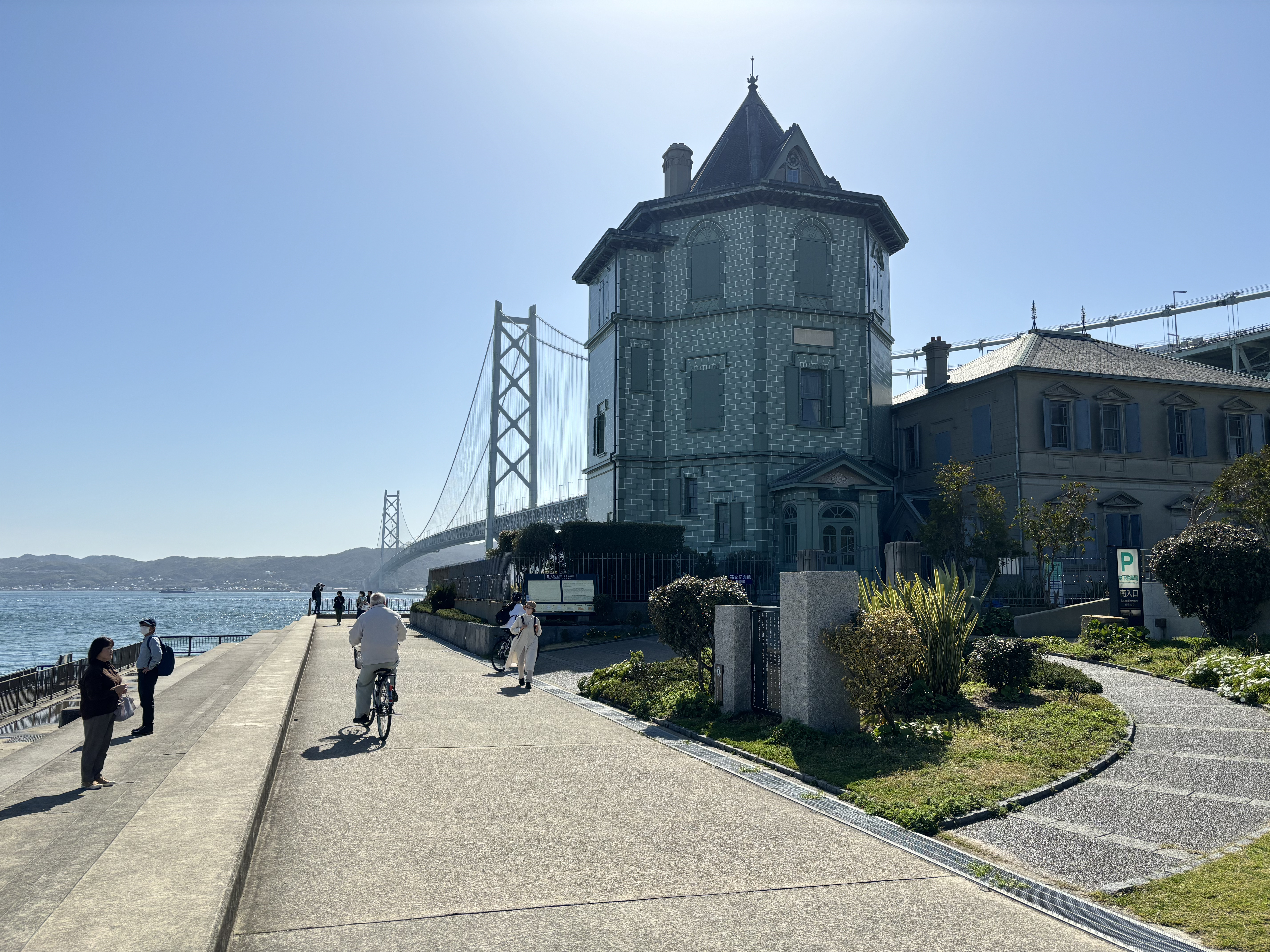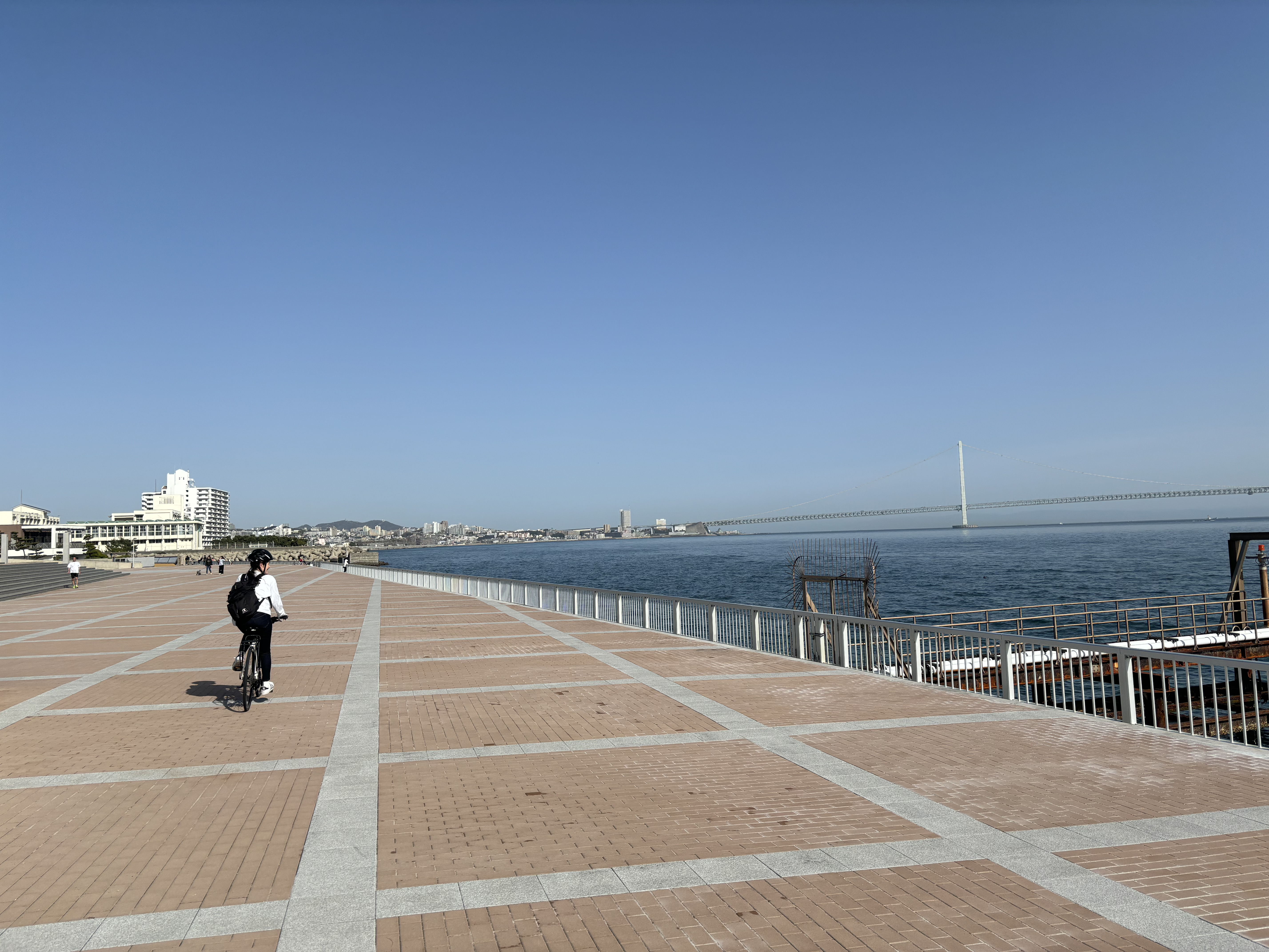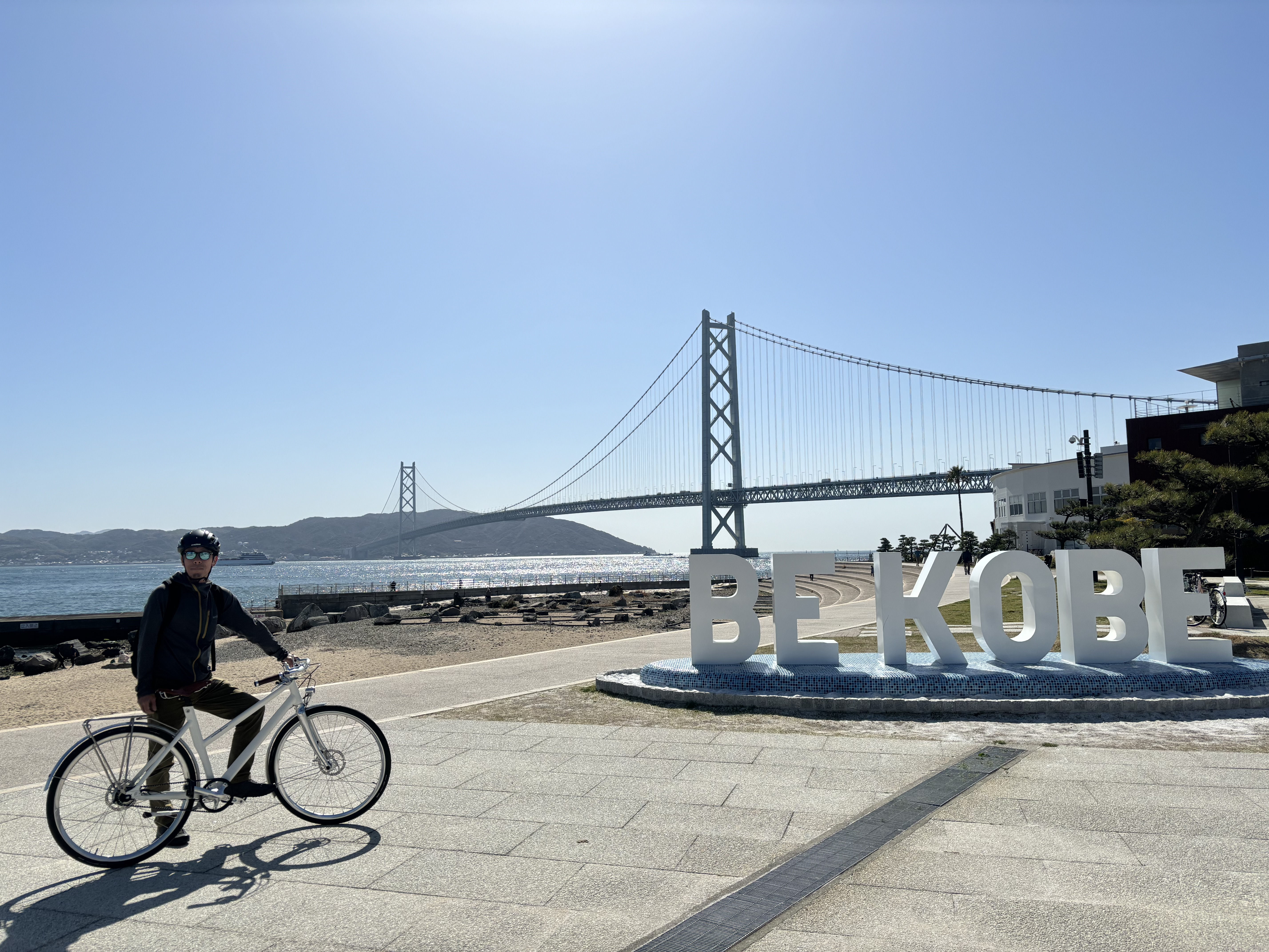 明石海峡大橋を望む絶景スポットで、海風が心地よく、橋の向こうに淡路島を望む開放的なロケーションです。「BE KOBE」のモニュメント前は、神戸の象徴的フォトスポットとして人気。散走の途中で立ち寄れば、旅の記念にぴったりの一枚が撮れるはず。 -