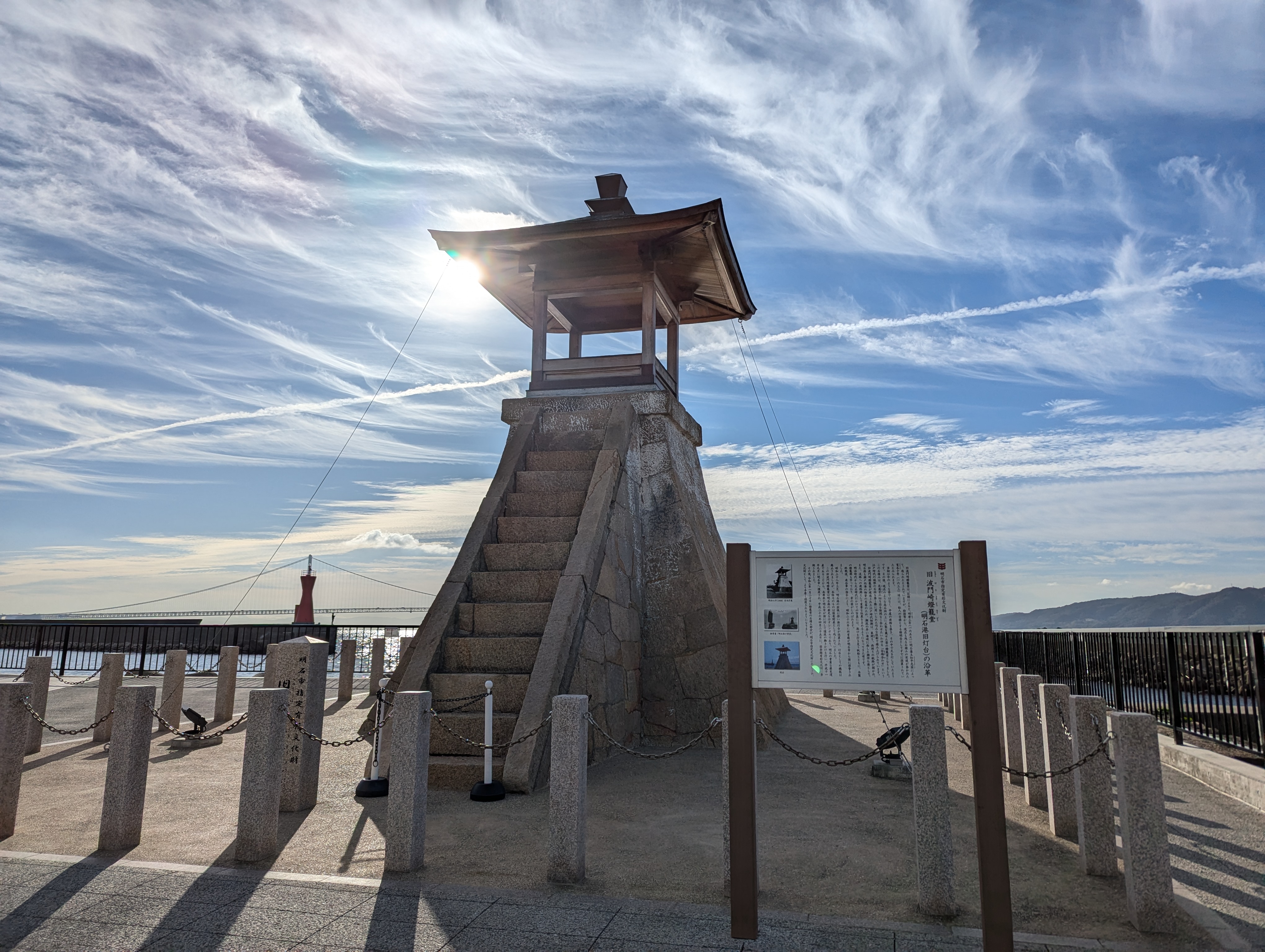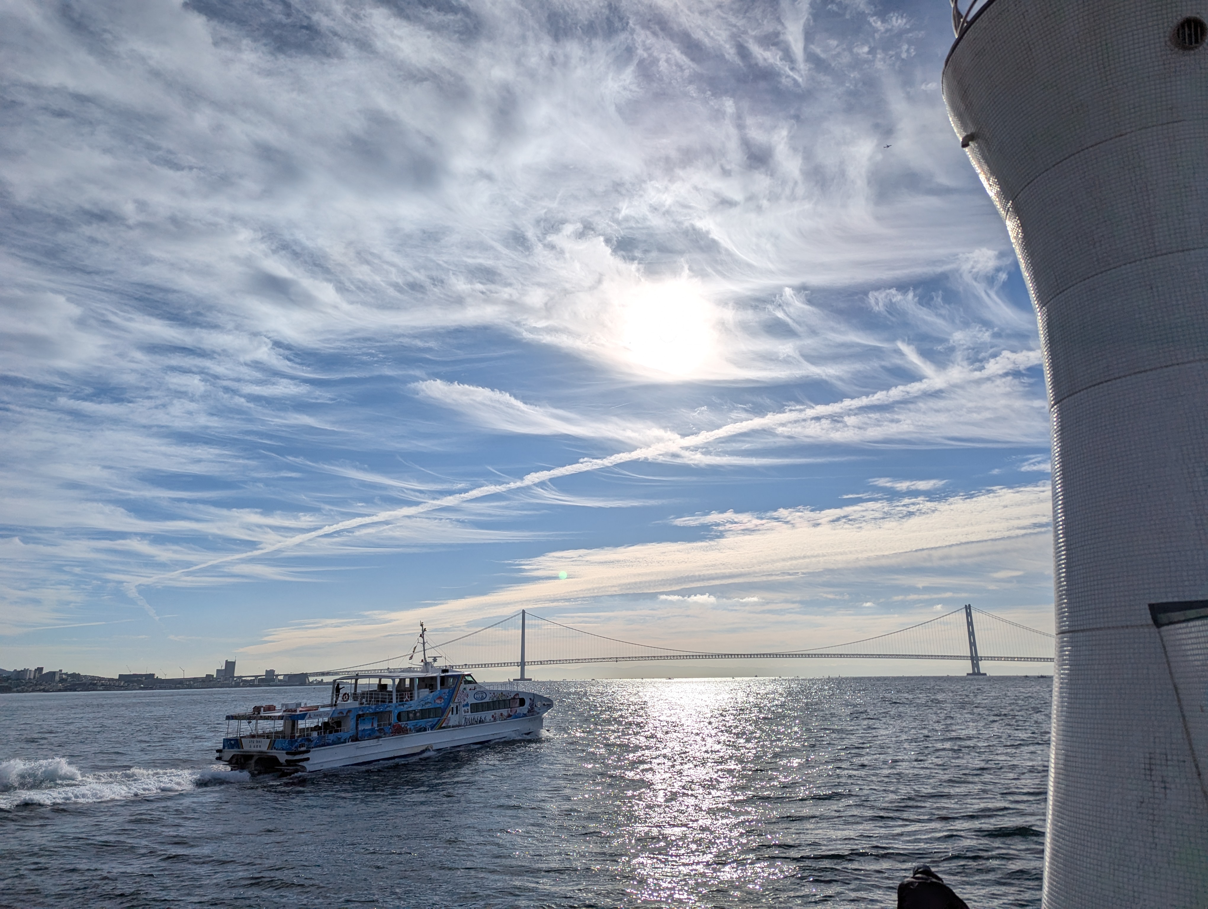 明石港旧灯台のそばは、淡路島へ向かうジェノバラインの発着地。足元では釣り糸を垂らす人々の姿もあり、のんびりとした時間が流れています。 -